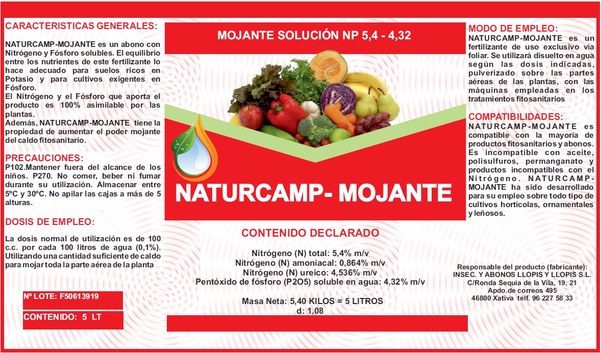 NATURCAMP MOJANTE tiene la propiedad de aumentar el poder mojante del caldo fitosanitario.
